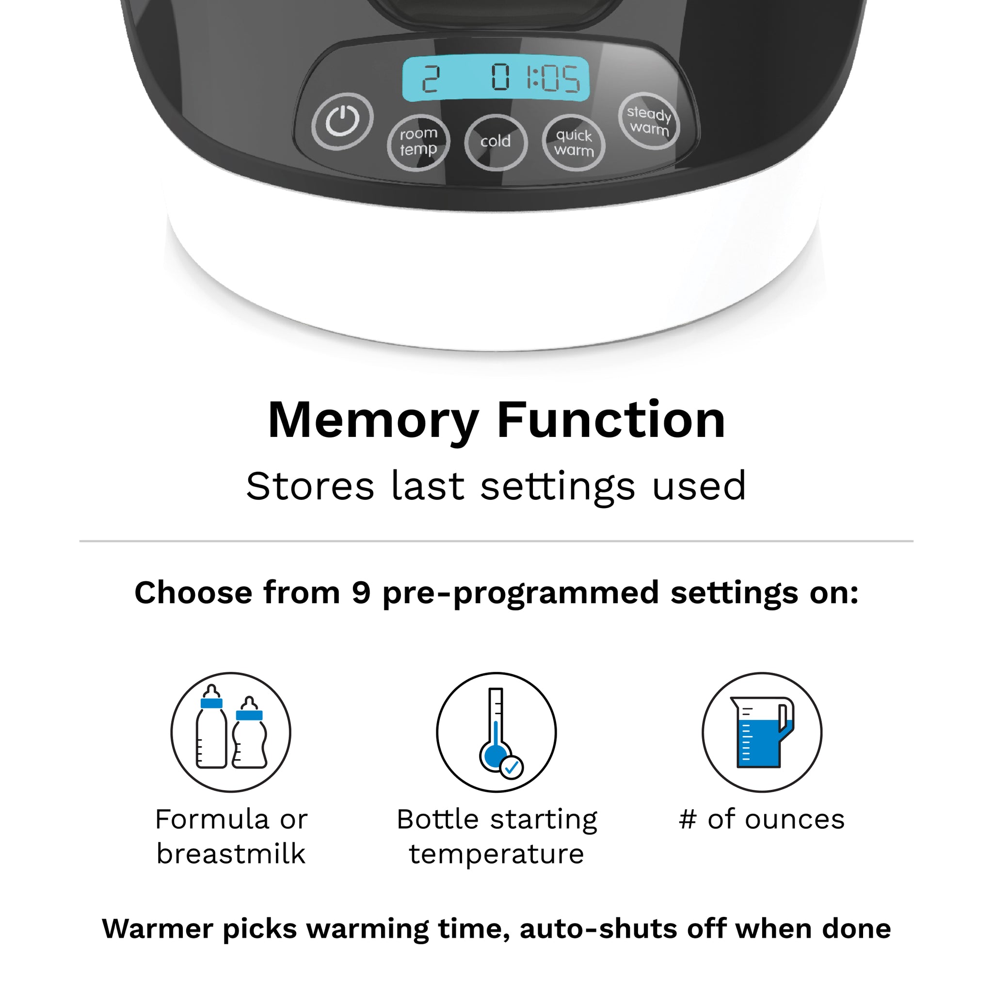 - Warms More Precisely than Other Warmers: Choose from 9 pre-programmed settings based on your number of ounces, starting temperature, and bottle material which allows the warmer to pick the proper warming time, then automatically shuts off when finished