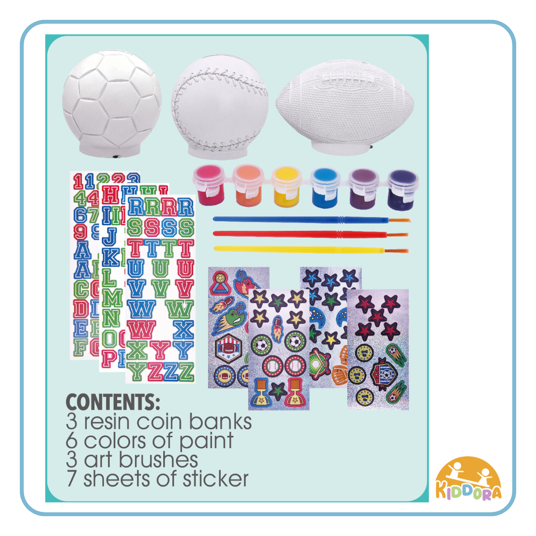 Get kids excited to create with the Art Kids Sports Coin Bank set! They can decorate resin coin banks shaped like soccer balls, footballs, and baseballs using paints and stickers.