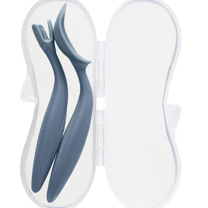 Our cutlery set has been designed with a leading paediatric occupational therapist (OT) as the ideal toolkit for tots who are ready to self feed. The unique spoon shape acts as shovel helping little ones to scoop up their food, even with a flat plate. The unique deep scoop spoon shape and angled handles encourages correct hand to mouth positioning, and helps to contain food within the spoon as bubs practices bringing it to his/her mouth, which means more food makes it to the mouth and less mess! Our unique flork has been designed to fit the size and shapes of little mouths. Its curved blunt prongs are gentler (and safer) on little mouths and gums. Set comes complete with a handy travel case to keep utensils clean before mealtime on the go, and after to prevent soiling in nappy bags or hand bag.
