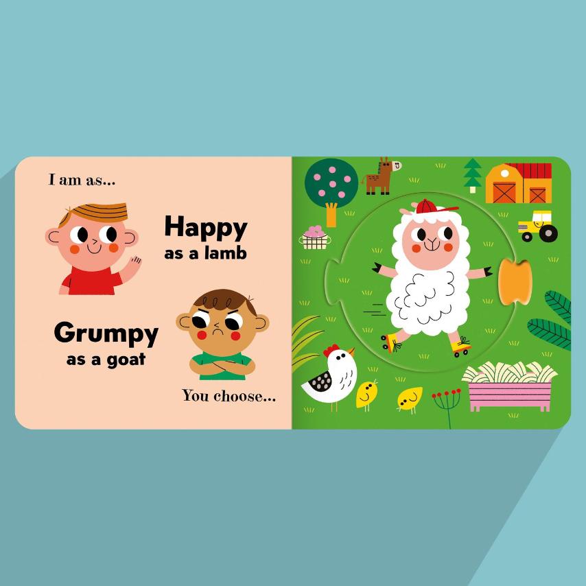 So, are you as HAPPY as a lamb or as GRUMPY as a goat? Look at the illustrations, choose your mood, and if you’re grumpy, jump around the room like a spring lamb to lift your mood. This uses role-play, exercise and humour. So try it with your child when their grumpy. You’ll be laughing at one another soon enough!