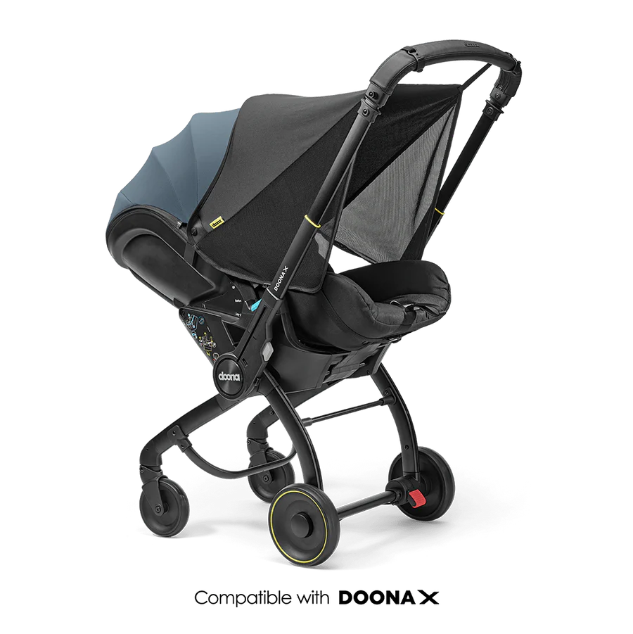 The Doona X Sunshade Extension is designed to protect your baby from direct sunlight using its multi-positional feature. The additional protective layer provides enhanced UV protection (UPF 50+). With the simple snap-on Doona connectors, attaching and removing the Sunshade Extension is quick and easy. A compact carry bag for easy storage when not in use is included.