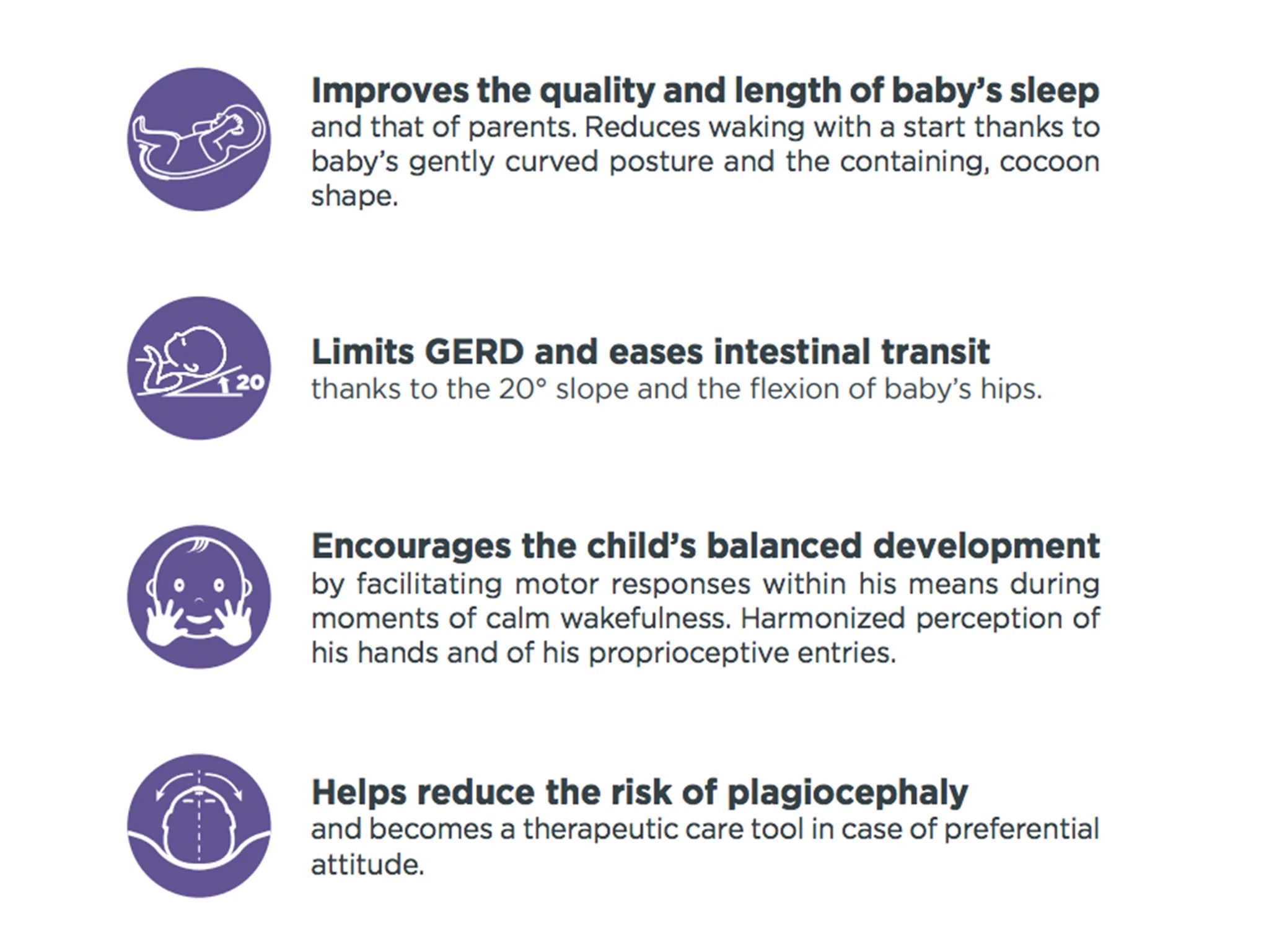 - Improves the quality and length of baby’s sleep and that of parents. Reduces waking with a start thanks to baby’s gently curved posture and the containing, cocoon shape.