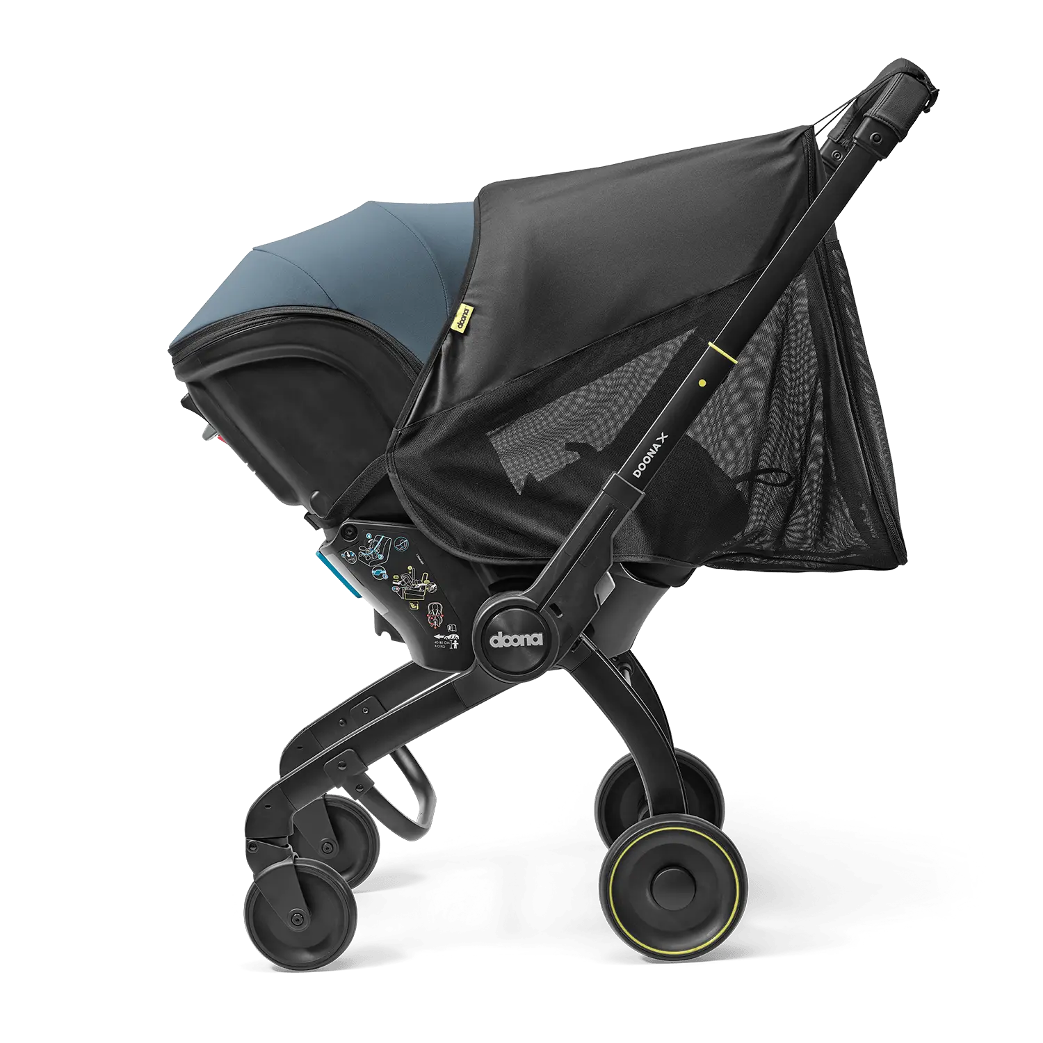 The Doona X 360° Protection is designed to protect your baby from bugs, insects, and direct sunlight, without limiting access to your baby. A compact carry bag for easy storage when not in use is included.