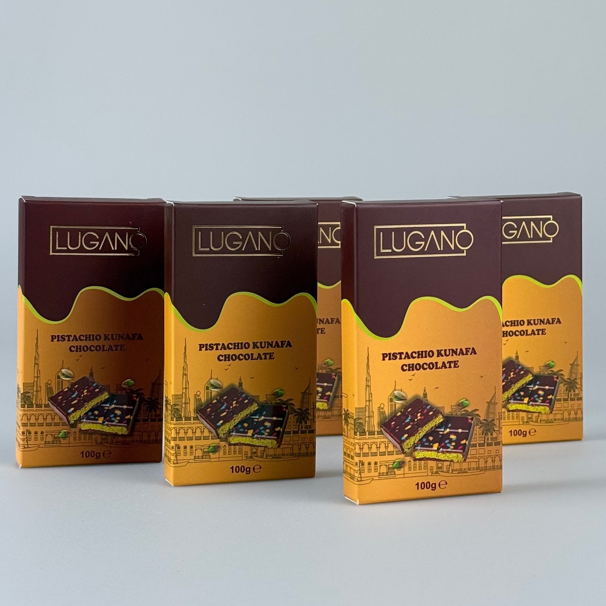 Inspired by the viral "Dubai Chocolate" trend, the Lugano Pistachio Kunafa Chocolate is a luxurious fusion of Middle Eastern dessert traditions and premium chocolate craftsmanship.