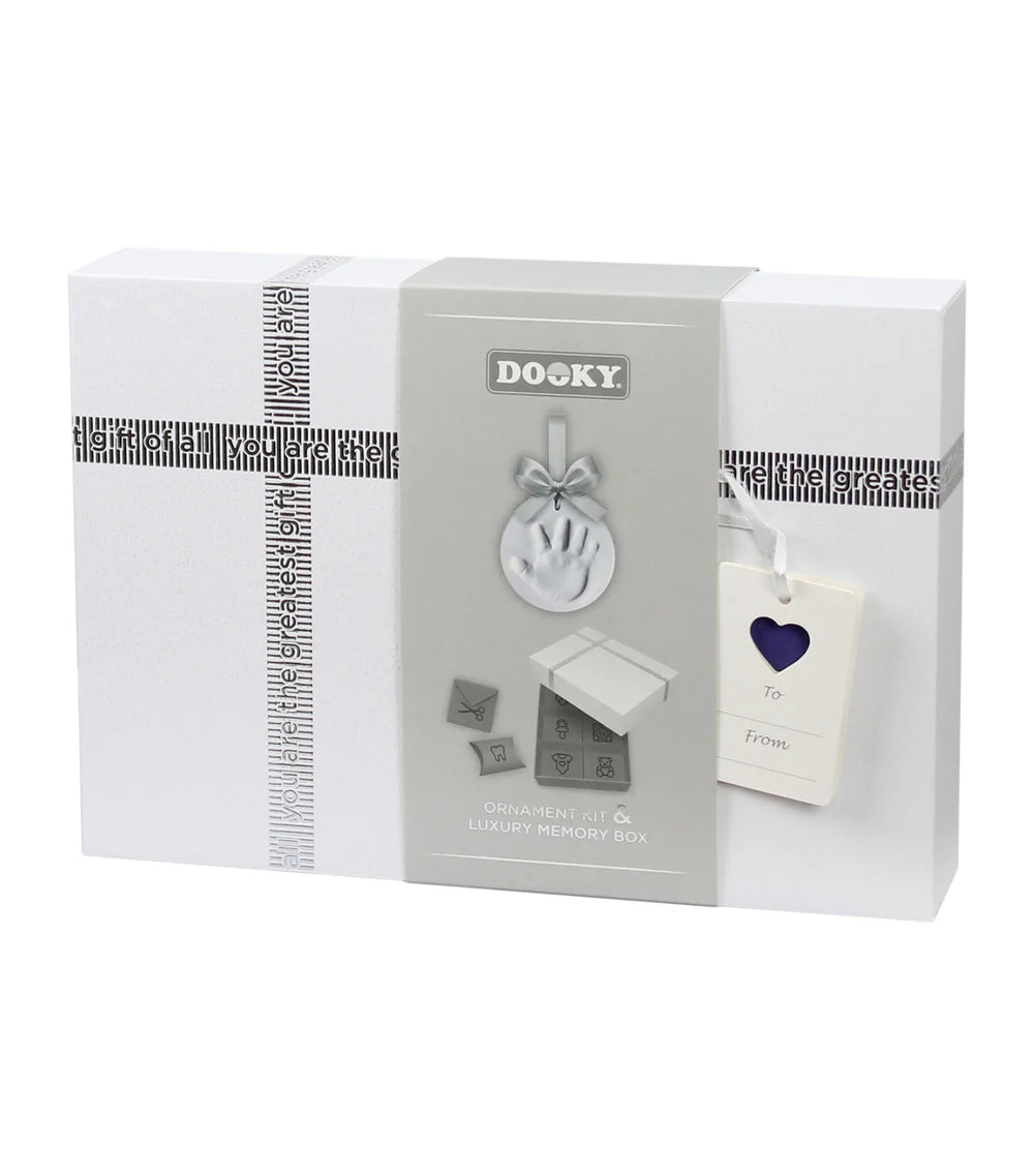 Create a timeless keepsake with the Dooky Gift Set: Ornament Kit & Memory box. This two-in-one set includes a round clay ornament to capture a tiny handprint or footprint and a luxurious memory box to store precious baby mementos.