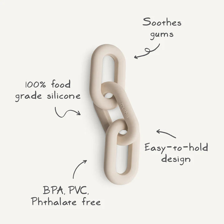 Offer comfort and relief with a teether designed to soothe sore gums throughout the entire teething journey. Made from 100% food-grade silicone, our teether is easily held by tiny hands. With three connecting links that mirror modern design aesthetics, parents can maintain their personal style while littles enjoy a practical and playful toy.