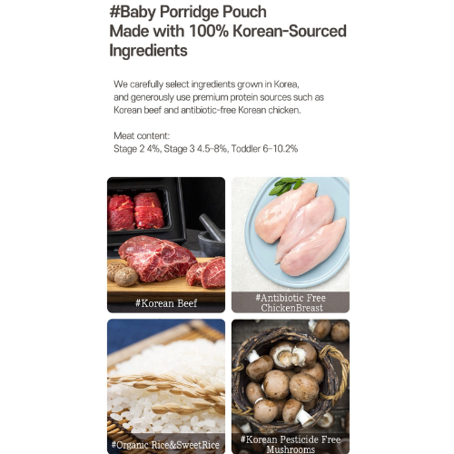 ~ Made with carefully selected organic Korean rice and various high-quality local Korean ingredients to provide balanced nutrition for babies.