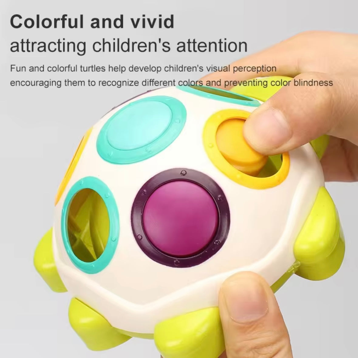 Kids press the colorful buttons to pop the balls in and out of the shell, improving recognition and matching skills. -
