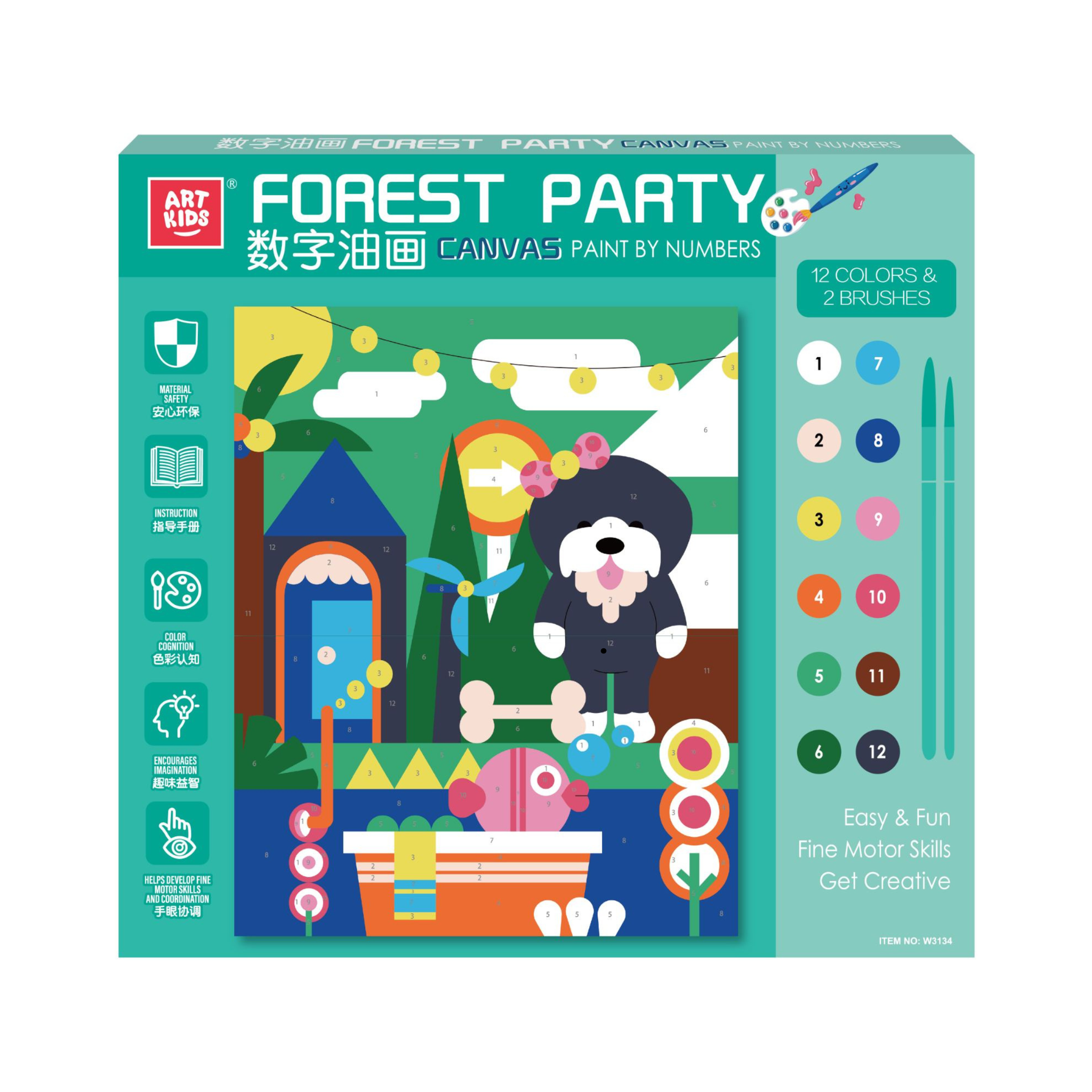 This ArtKids Forest Party Paint by Numbers kit is a beginner-friendly art set designed specifically for children. It features a vibrant, whimsical forest scene with a central dog character, a fish pond, and various geometric elements.