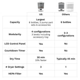 - Kills 99.9% of germs with natural steam, then automatically dries 33% faster with hot air that’s 95% germ-free due to the replaceable HEPA filter; Products remain sterilized inside for up to 48 hours